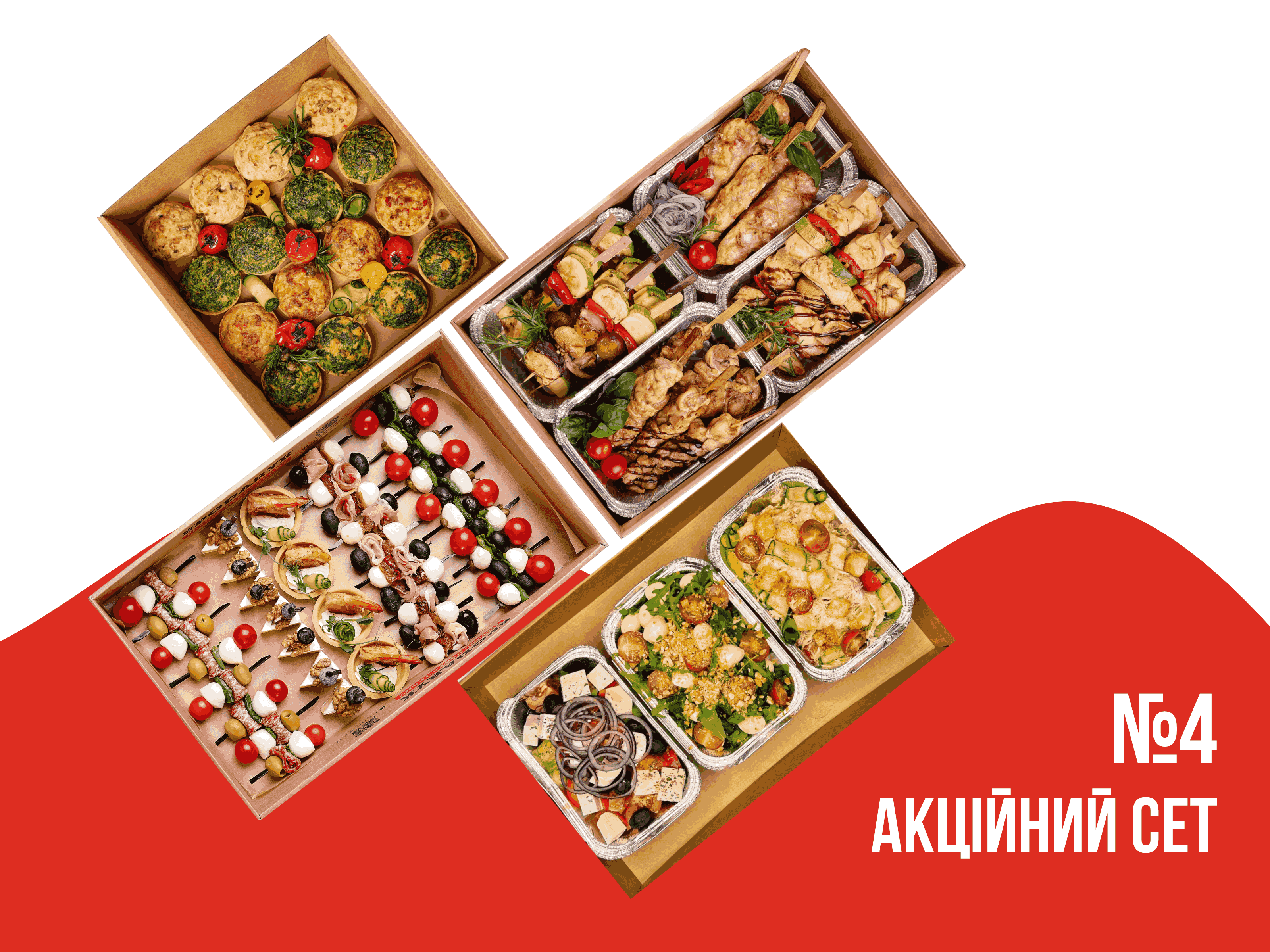 У цьому наборі: свіжі салати, міні-кіші, вишукані закуски Finger Food та ароматний гриль бокс.